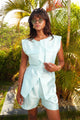 This aqua set comes alive in movement, with a gentle iridescence that mimics water’s surface. Finished with a matching belt to cinch or let loose.